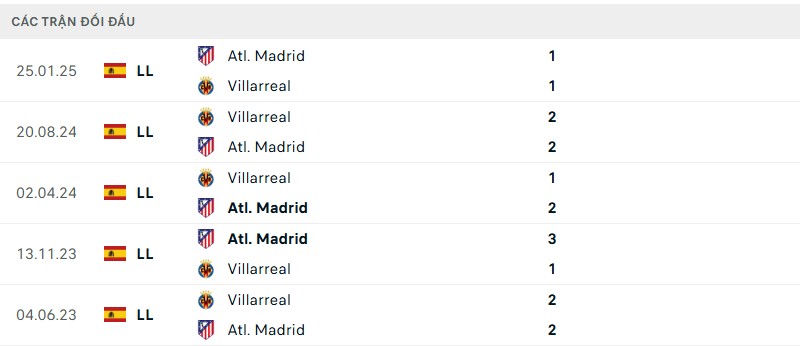 Lịch sử đối đầu giữa hai đội khá cân bằng, trong những năm gần đây, những trận đấu giữa Atletico Madrid vs Villarreal thường kết thúc với kết quả bóng đá hòa. Điều này cho thấy Villarreal luôn là một đối thủ "khó nhằn" với lối chơi kỷ luật và khả năng gây bất ngờ trước Atletico. Tỷ số thường thấy trong các trận đấu của họ là 1-1, 2-2 hay thậm chí là hòa 0-0.