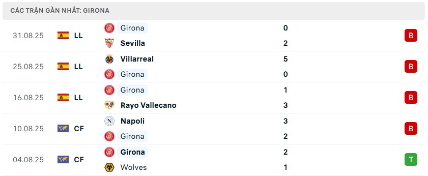 Theo tin bóng đá Girona đang trải qua một giai đoạn khủng hoảng thực sự, toàn bộ các trận đấu của họ từ đầu mùa đều là những trận thua. Đội bóng của HLV Míchel đã để thua trước Rayo Vallecano, Villarreal và Sevilla, đều với cách biệt khá lớn. Điều này đang đặt ra một dấu hỏi lớn trong các bài nhận định bóng đá về khả năng cạnh tranh của họ ở mùa giải này.