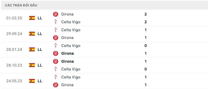 Lịch sử đối đầu giữa Celta Vigo vs Girona cho thấy đây là một cặp đấu khá cân bằng. Trong 19 lần chạm trán trước đây, Celta Vigo có 7 chiến thắng, Girona có 6 chiến thắng và hai đội hòa nhau 6 lần. Điều đáng chú ý là trong ba trận gần nhất hai đội gặp nhau đều có kết quả hòa, thể hiện sự ngang tài ngang sức.