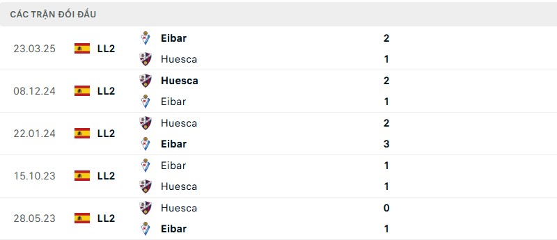 Lịch sử đối đầu đang nghiêng về Eibar với 4 chiến thắng trong 6 lần gặp nhau gần nhất. Tuy nhiên, yếu tố sân nhà lại là một lợi thế lớn, được thể hiện rõ khi mỗi đội đều thắng 2-1 trên sân nhà ở mùa trước. Điều này mang lại sự tự tin không nhỏ cho Huesca trước trận lúc 0h30 ngày 02/09/2025.