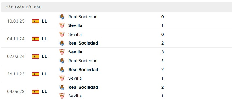 Thành tích đối đầu giữa Real Sociedad vs Sevilla